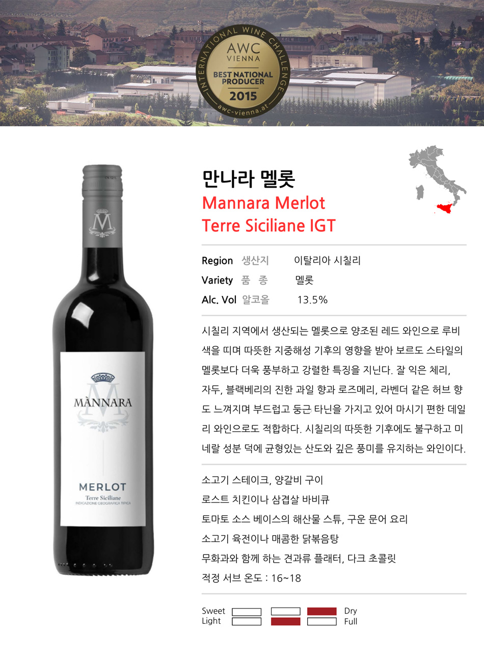 MANNARA MERLOT TERRE SICILIANE IGT | 생산지 시칠리 | 품종 멜롯 | Alc. 13.5%